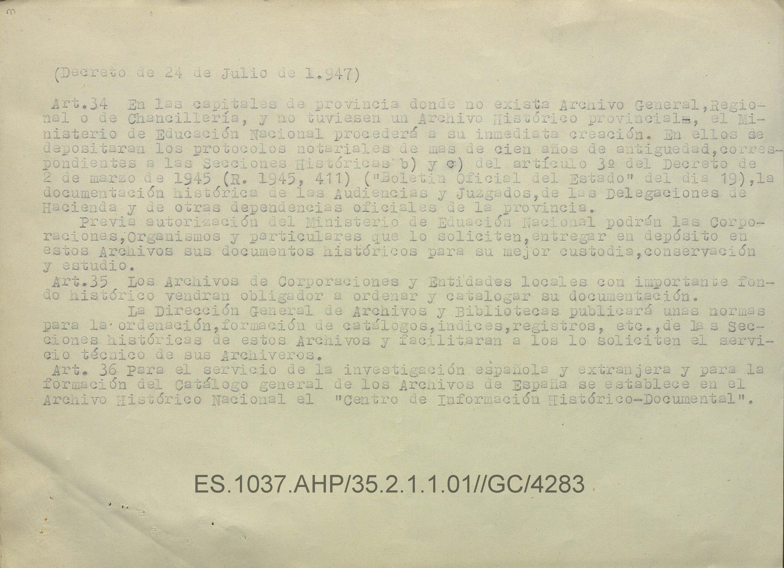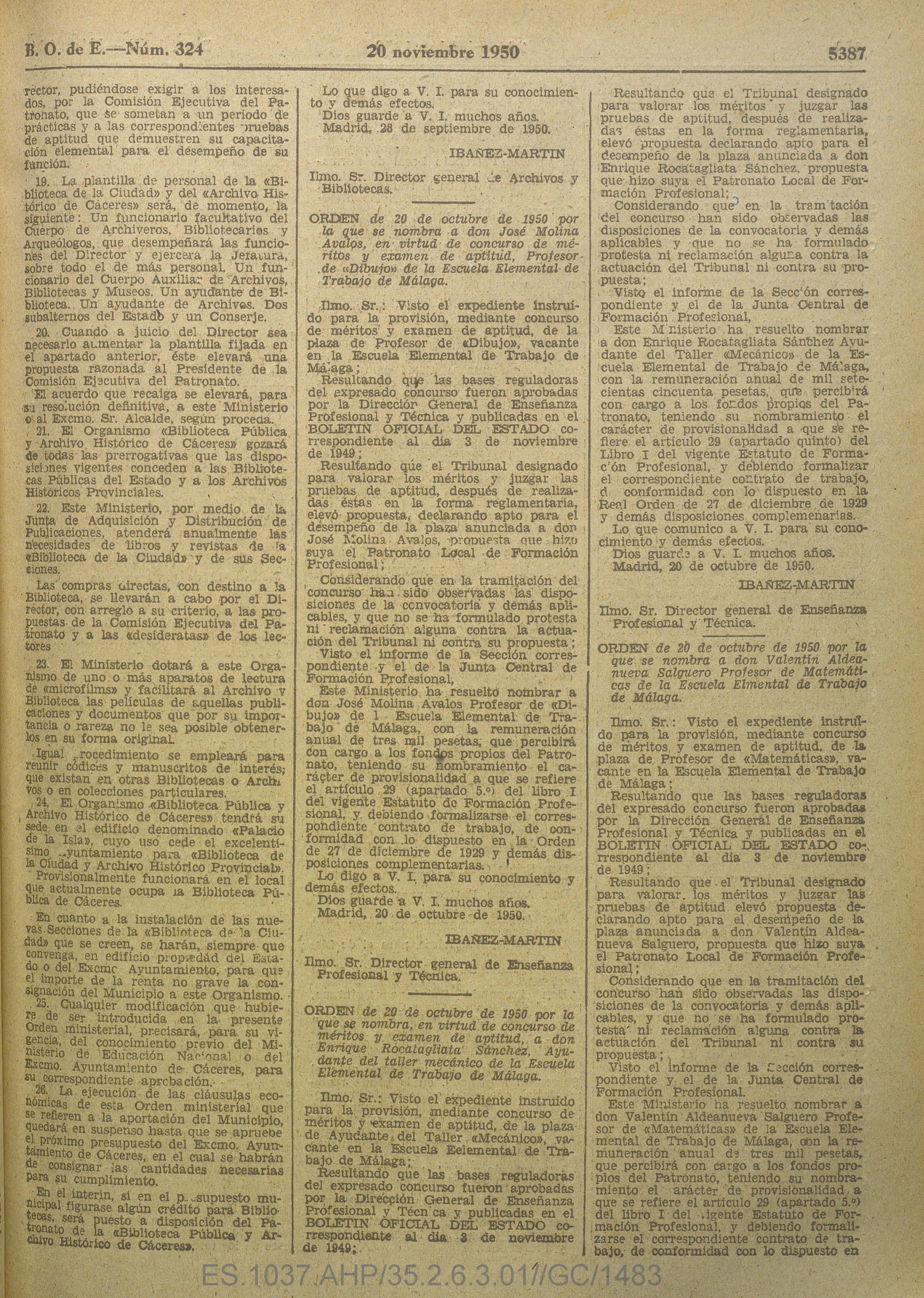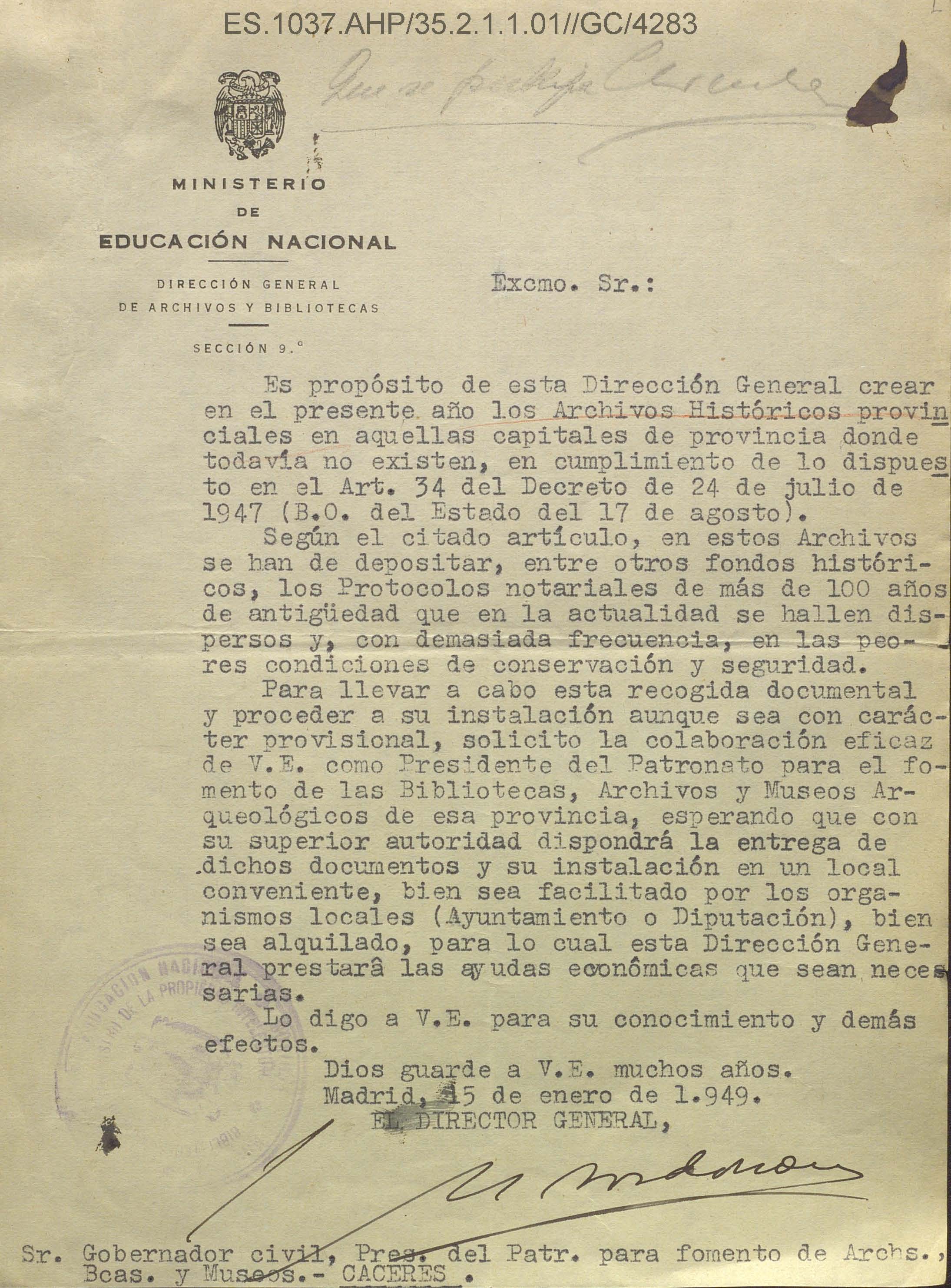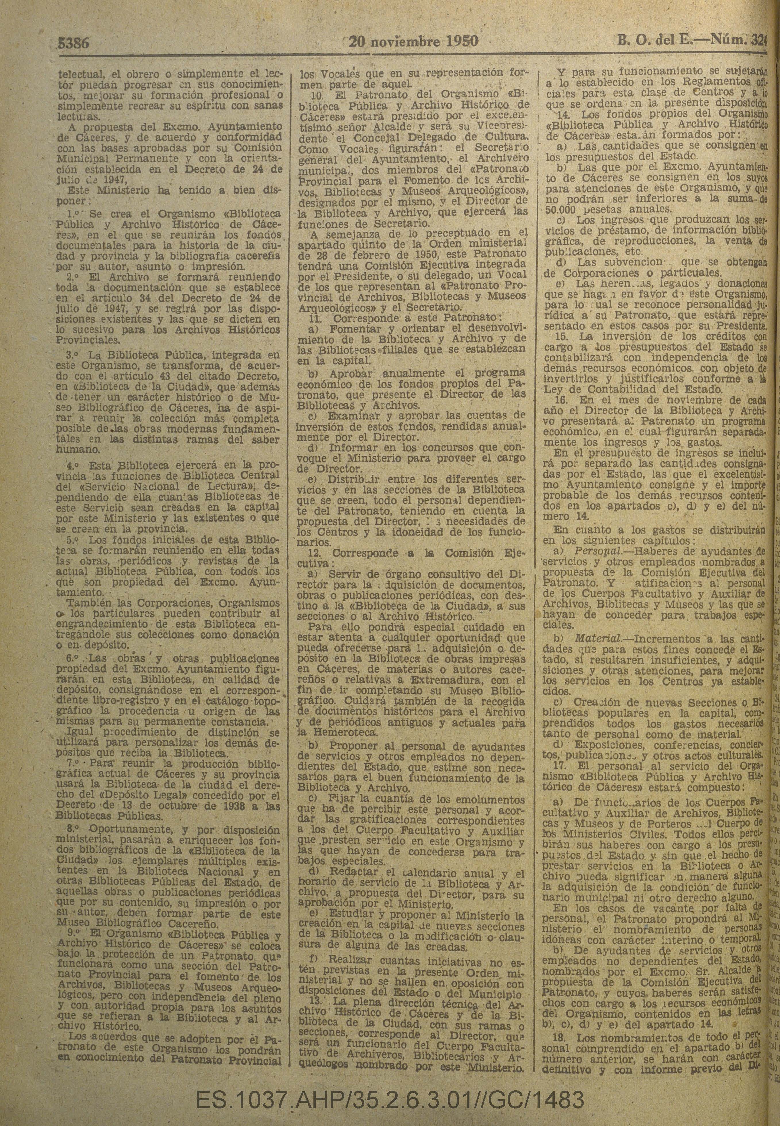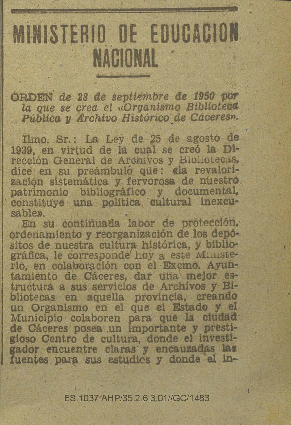 Orden del Ministerio de Educación Nacional del 28 de septiembre de 1950 sobre la creación del organismo Biblioteca Pública y Archivo Histórico de Cáceres.